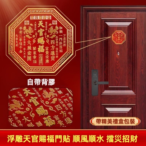 天官賜福 八方來財 特製八邊形門貼 取“天圓地方”之意 打破傳統方角 造型雅緻更顯獨特 紅金配色 貼於門上 福氣圓滿到家