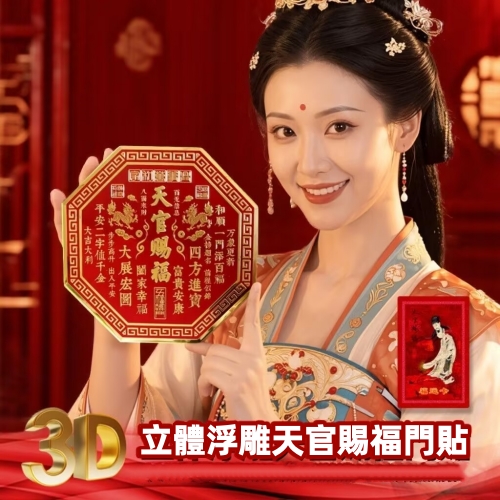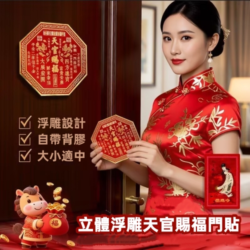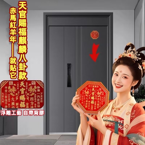 天官賜福 八方來財 特製八邊形門貼 取“天圓地方”之意 打破傳統方角 造型雅緻更顯獨特 紅金配色 貼於門上 福氣圓滿到家
